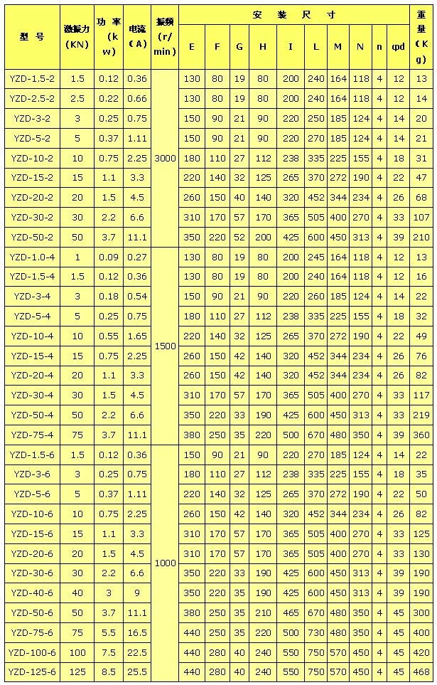 產(chǎn)品概述:YZD系列振動電機產(chǎn)品概述: YZD系列振動電機是在轉(zhuǎn)子軸兩端各安裝一組可調(diào)偏心塊,利用軸及偏心塊高速旋轉(zhuǎn)產(chǎn)生的離心力得到激振力。振動電機的激振力高、能耗小、噪音低、壽命長