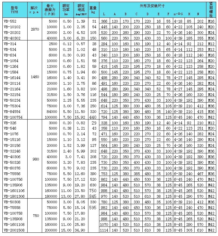 VB系列振動電機(jī)技術(shù)參數(shù)