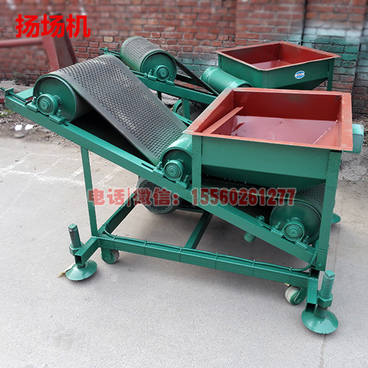 揚(yáng)場(chǎng)機(jī)主要由大架、進(jìn)料斗、電機(jī)、支撐絲桿、傳動(dòng)輪、拋糧帶、壓帶輪等部件構(gòu)成,用于玉米、小麥、蕎麥、稻種、黃豆、綠豆等顆粒狀物料的除雜,糧食谷物進(jìn)入料斗后在高速運(yùn)轉(zhuǎn)下迫使物料向前上方運(yùn)動(dòng)由皮帶送出,皮帶為特殊加工的多坑圓點(diǎn)輸送帶,具有定向作用,便于糧食的收集,根據(jù)物料及雜質(zhì)比重的不同,分別將其堆成堆。